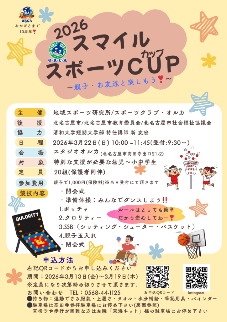2026年2月24日 2026年3月12日 健黒田 イベント情報 2026スマイルスポーツCUP 2026スマイルスポーツCUPのお知らせです🌟 お申込みはこちらから!お持ちしております😄 ※車椅子の方や歩行が困難な方は事前にお知らせください。(お申込時にメッセージ欄にご入力ください。) お子様の名前(漢字表記) おこさまのなまえ(ひらがな) 園名・学校名 性別 男の子女の子 学年 年少年中年長小1小2小3小4小5小6 生年月日(西暦でご入力ください。[例]2018.1.29) 保護者名 連絡先 メールアドレス メッセージ本文 (任意) ※内容に間違いが無ければチェックして送信してください。 Δ FacebookXBlueskyCopy